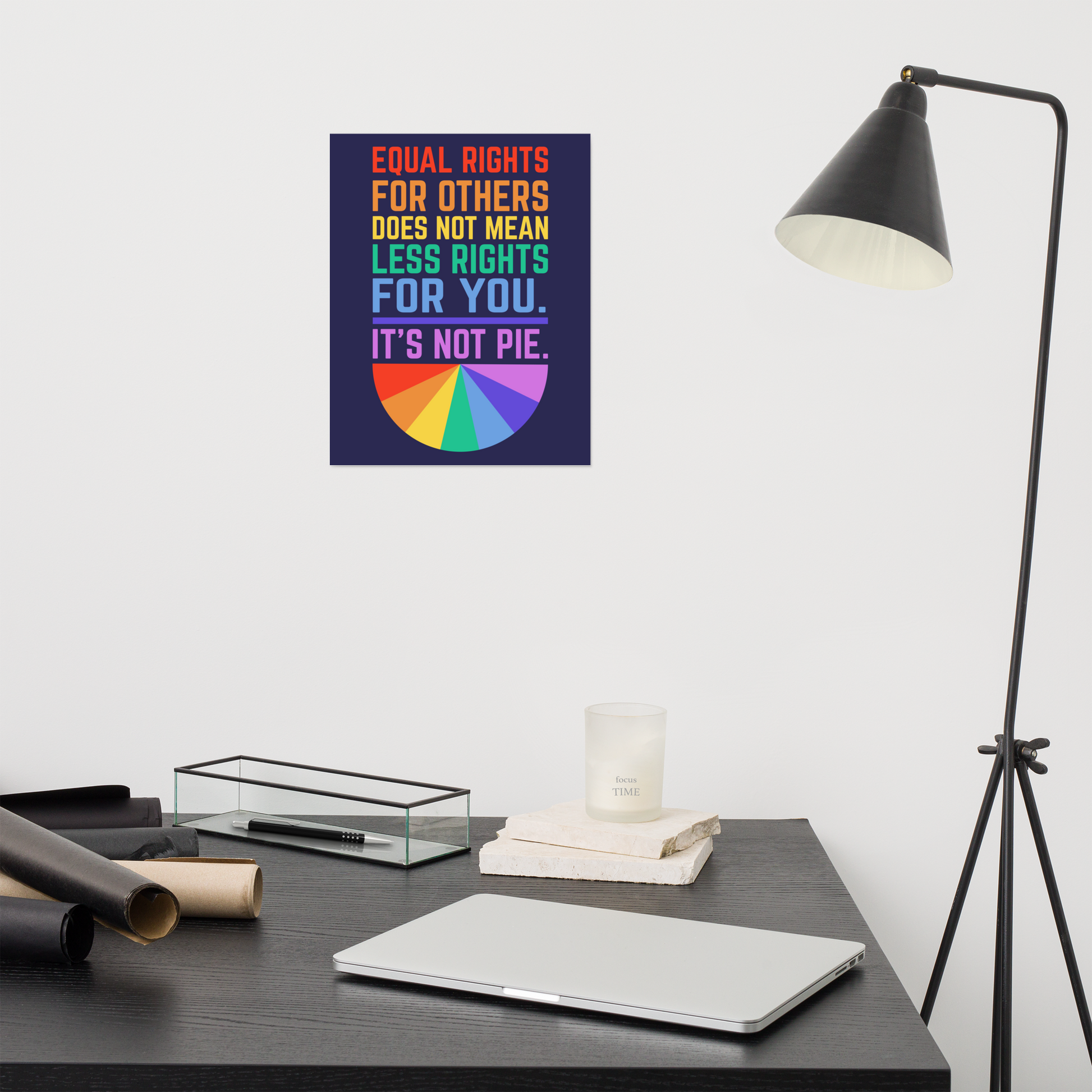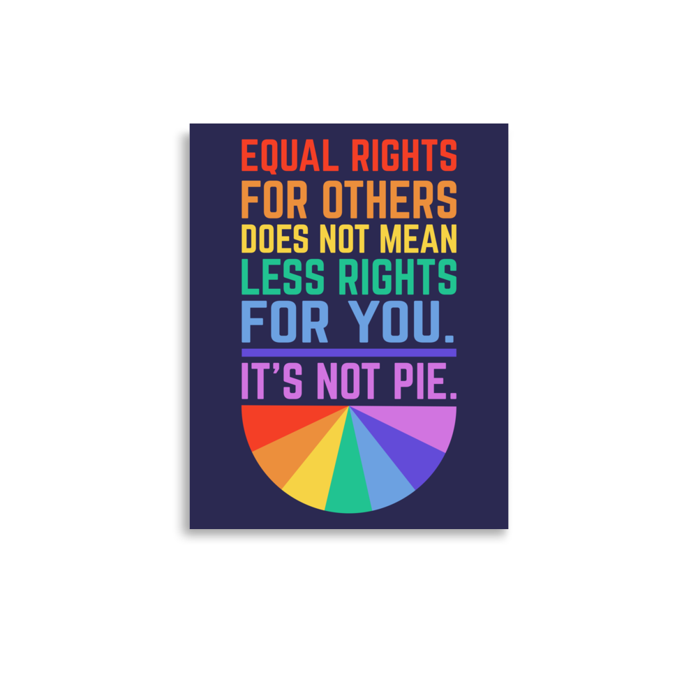 This 11″×14″ poster is printed on premium enhanced matte paper, offering a thick, durable feel and a glare-free finish. The vibrant, colorful design boldly proclaims, “Equal rights for others does not mean less rights for you. It's not pie,” bringing both energy and a powerful message to any space. Perfect for bedrooms, offices, or as a thoughtful gift that inspires conversation and reflection.